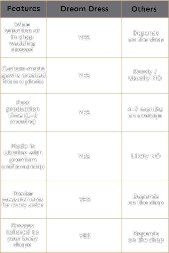 Whether you pick an in-shop gown or order a custom design, we’ll help you choose and tailor a dress that truly matches your style, body shape, and vision. 👰